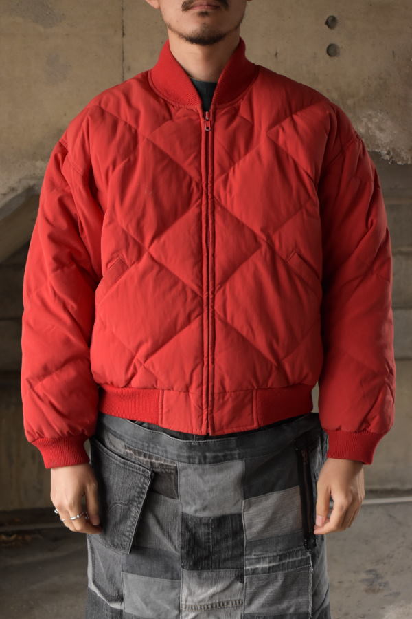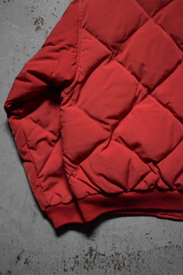 目を惹く真っ赤な色味のボディと、Eddie Bauerらしいダイヤキルトが特徴的な一着になります。