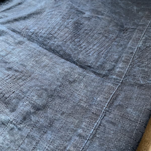 フロント部分には刺し子を、摩耗しやすいヒップ部分にはタタキを、サイドにはポケットを施しました。